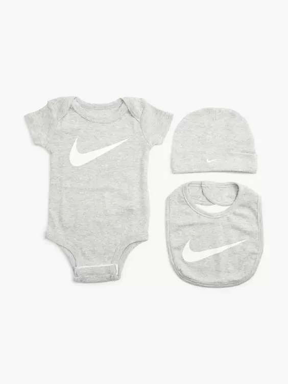 Das dreiteilige Nike Set beinhaltet eine Mütze, einen Kurzarm-Body und ein passendes Lätzchen. Es besteht aus weichem Baumwoll-Strickmaterial und sorgt damit für einen abgestimmten Look, der für Tragekomfort sorgt.